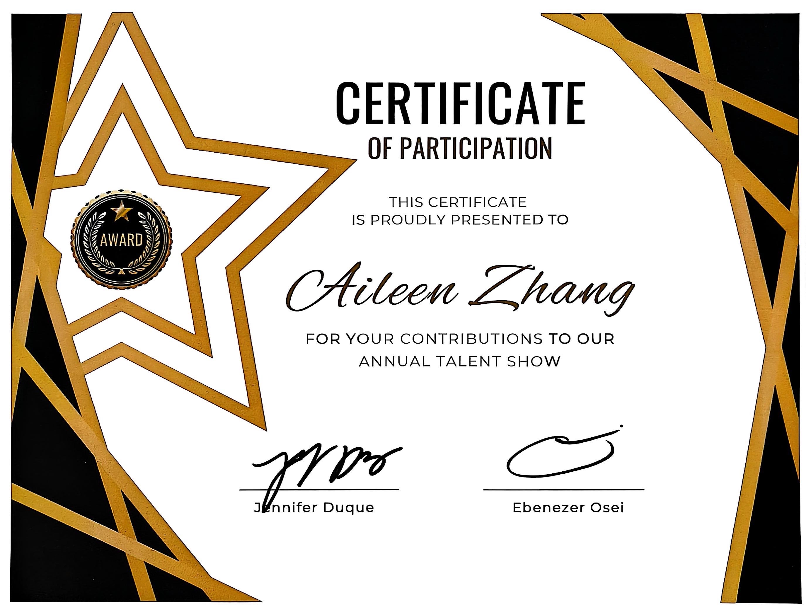 Stanford Summer Session Annual Talent Show Certificate of Participation - - Certificate link Stanford University Aileen Zhang Aug 2, 2025 San Francisco, CA USA |